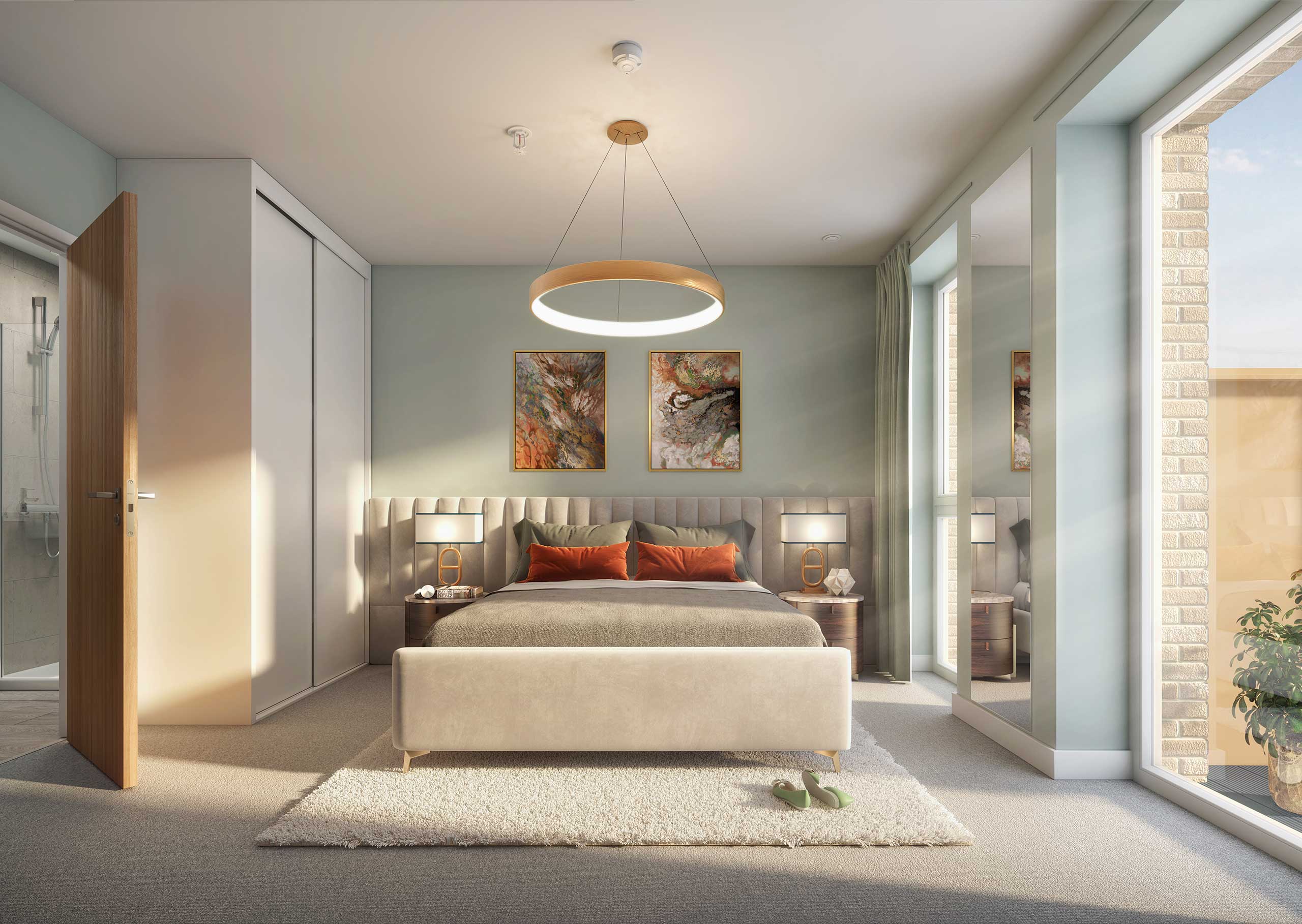 CGI internal disclaimer: Internal computer generated images are intended for illustrative purpose only. They are not representative of final layout or interior. Room styling and all related items such as furniture, soft furnishing, some window treatments and feature wall colours etc are not part of the specification and are for styling purposes only. Please refer to the specification section for more details or check specific layouts with our Sales Consultant. Images showing views are based on the site at the time the image is produced. Views are based upon the apartment location and elevation and are subject to change based on any future neighbouring developments. Therefore, a view which is unrestricted now may be restricted in the future.